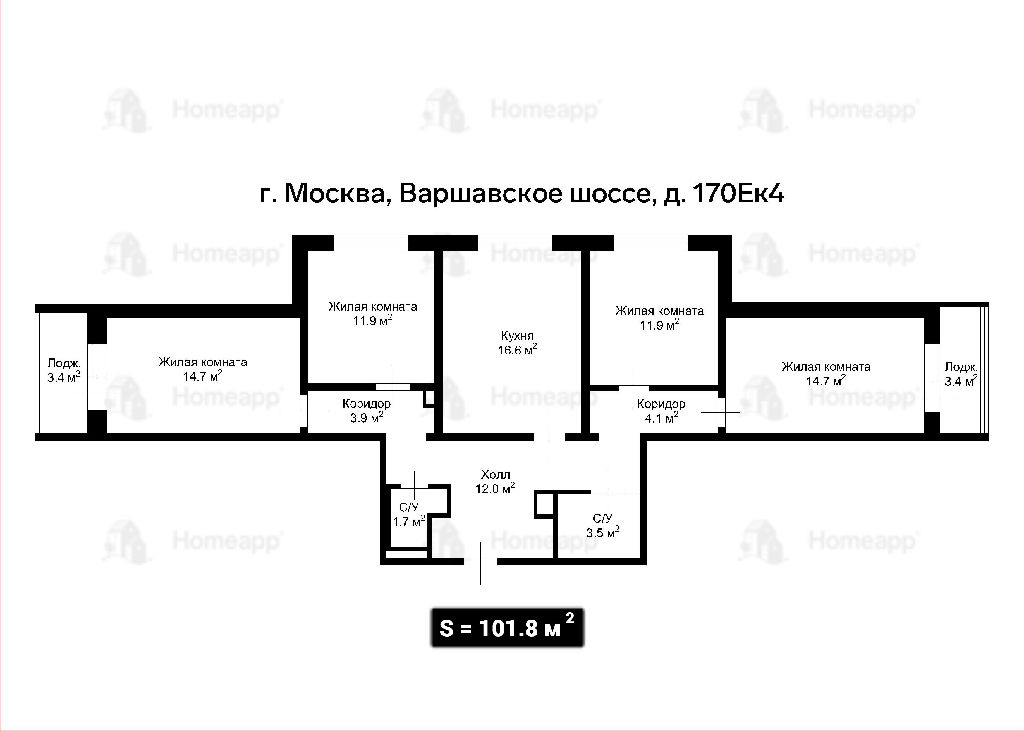 Комнаты: 14.7-11.9-14.7-11.9 м2
